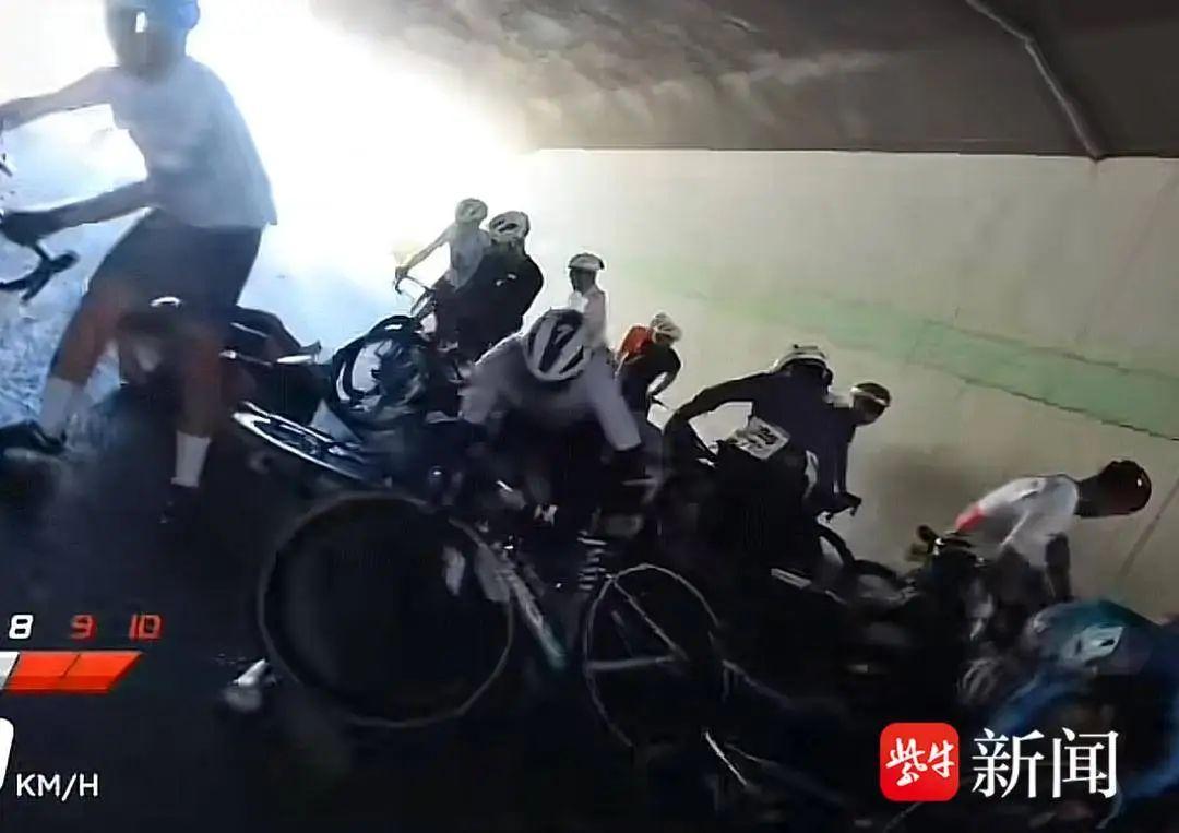 从视频画面中可以看到,被超车的参赛者摔车后躺倒在地,由于事发突然,后方车手来不及做出避让反应,疑似导致其头部被碾压。此外,在事发隧道内,多名车手因受到事故波及而身体受伤、车辆受损,不得不停下休整。