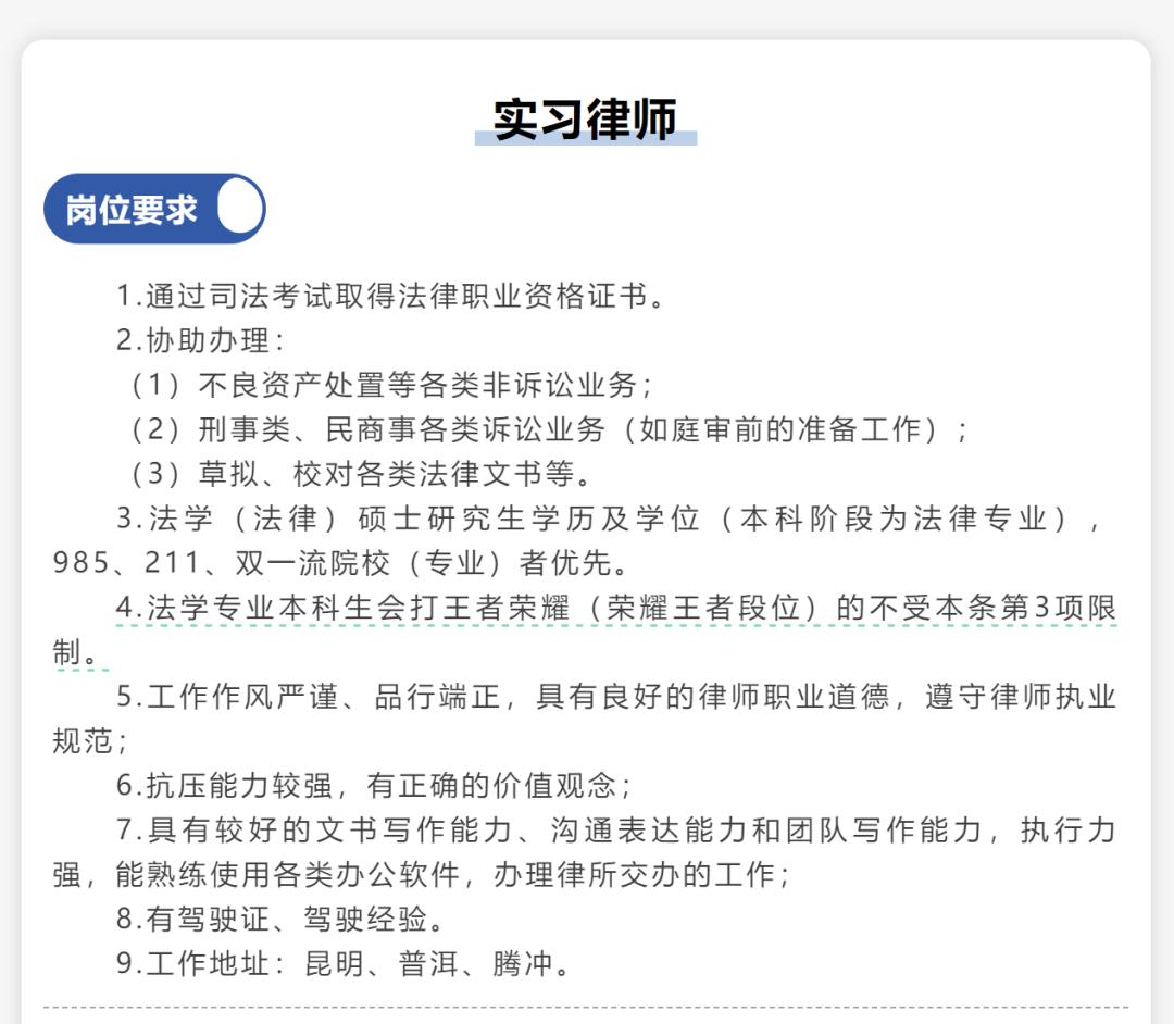 应聘者的游戏段位高,学历要求可适当放宽!近日,云南一家律师事务所招聘实习律师的一个条件引发网民关注。