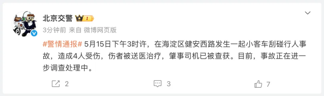 北京交警:海淀区发生小客车刮碰行人事故致4人受伤 肇事司机被查获