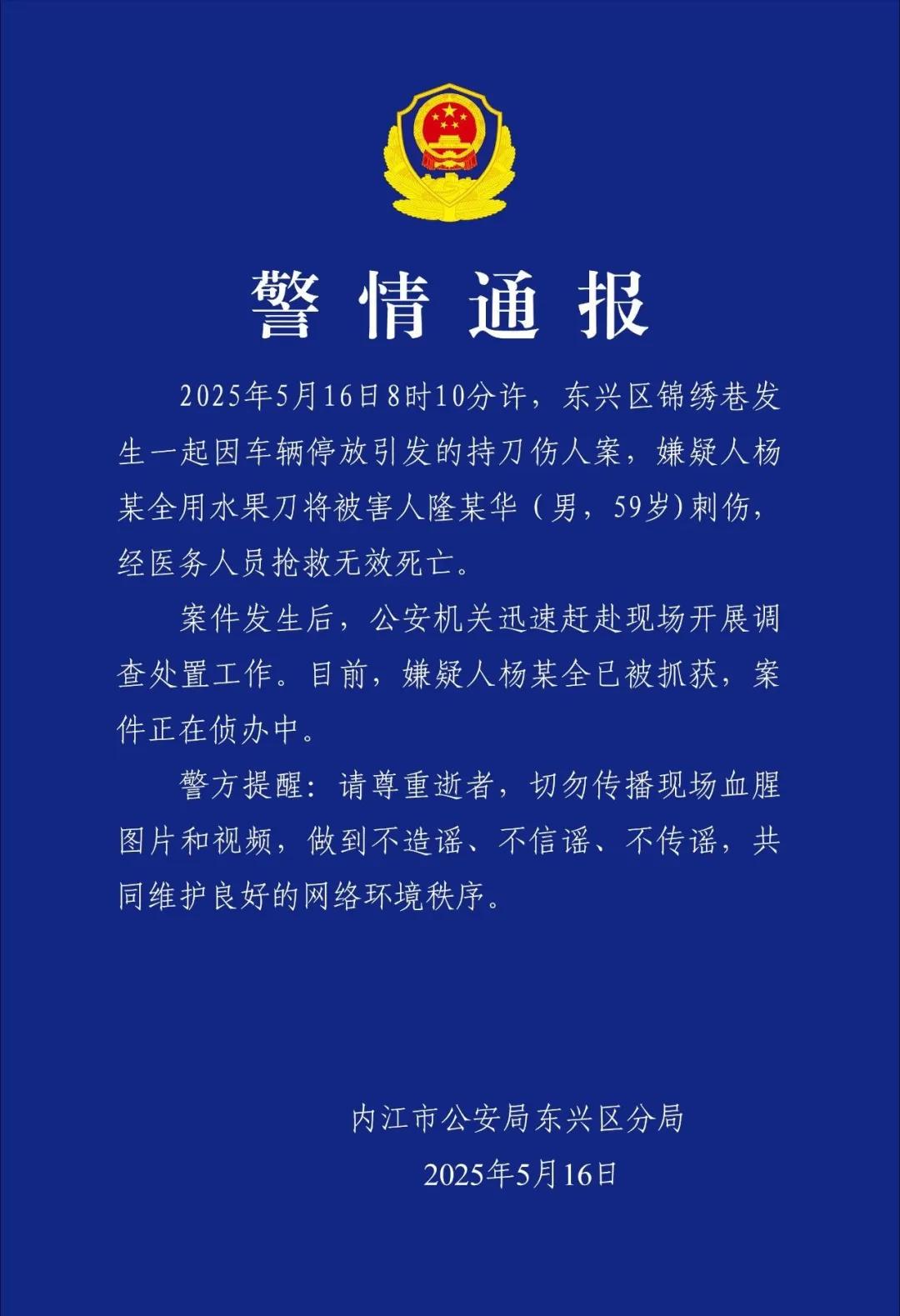 内江发生一起持刀伤人案,警方通报:嫌疑人用水果刀将被害人刺伤致死,已被抓获