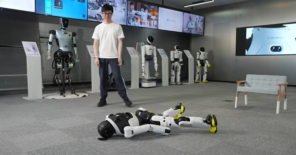 当稚晖君故意将灵犀X2绊倒后,它可以任意姿态恢复平衡并快速站起来。