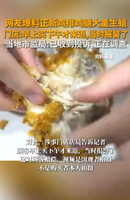 5月15日,贵州仁怀,有网友发布视频称,顾客购买正新鸡排的鸡腿后发现了大量的蛆。