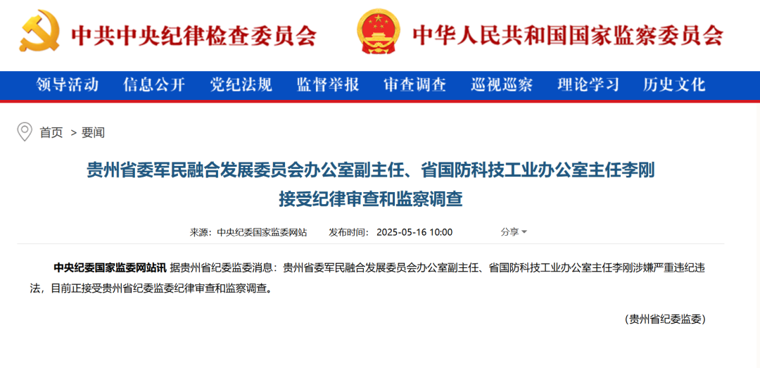 中央纪委国家监委网站讯 据贵州省纪委监委消息:贵州省委军民融合发展委员会办公室副主任、省国防科技工业办公室主任李刚涉嫌严重违纪违法,目前正接受贵州省纪委监委纪律审查和监察调查。