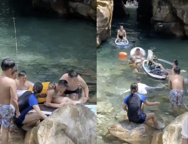 据网友介绍,今年五一期间,在一位刘姓驴友的组织下,22名驴友进入此地玩水,然而发生不幸,其中一人溺亡。上游新闻记者从相关视频中看到,在一处溪谷,众人正在对一名疑似溺水昏迷的男子进行施救。救助者先是托着该男子的头,将其运送至溪谷浅水区,然后又将该男子从水中救起,平置在一块桨板上,并立即采取按压胸腔和人工呼吸等急救措施。不过报料者称,该男子最终不幸身亡。