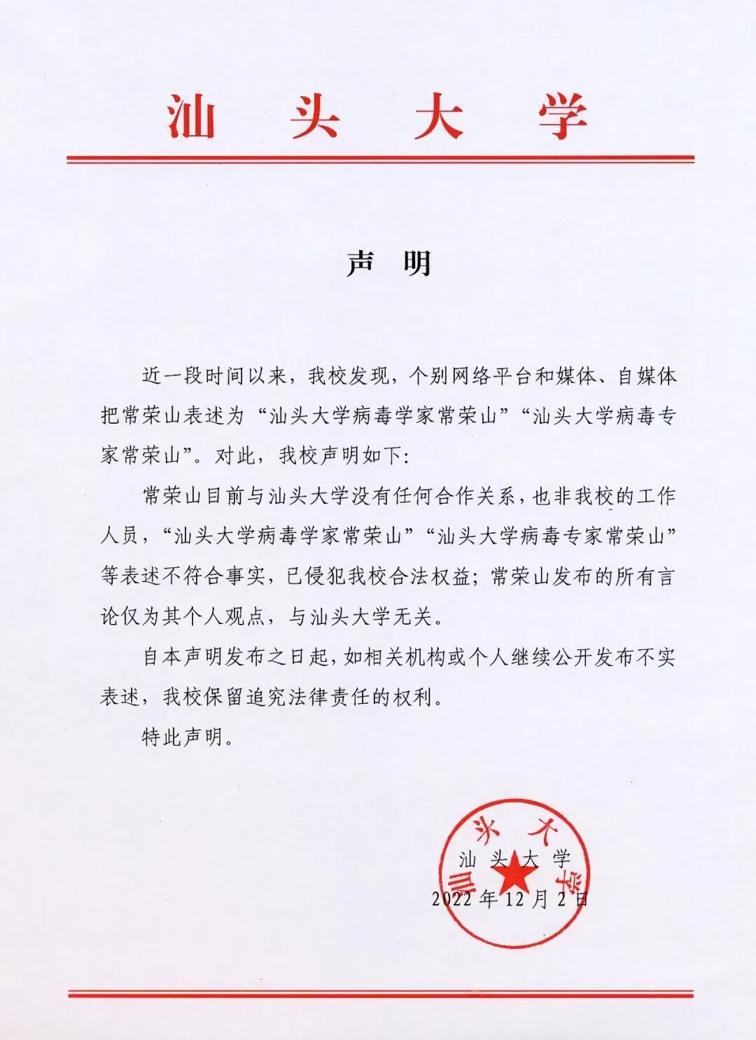 声明指出,“汕头大学病毒学家常荣山”“汕头大学病毒专家常荣山”等表述不符合事实,已侵犯该校合法权益;常荣山发布的所有言论仅为其个人观点,与汕头大学无关。