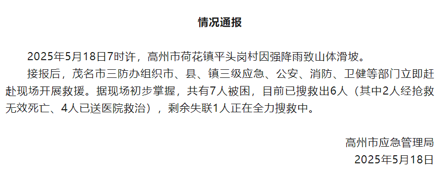 接报后,茂名市三防办组织市、县、镇三级应急、公安、消防、卫健等部门立即赶赴现场开展救援。据现场初步掌握,共有7人被困,目前已搜救出6人(其中2人经抢救无效死亡、4人已送医院救治),剩余失联1人正在全力搜救中。