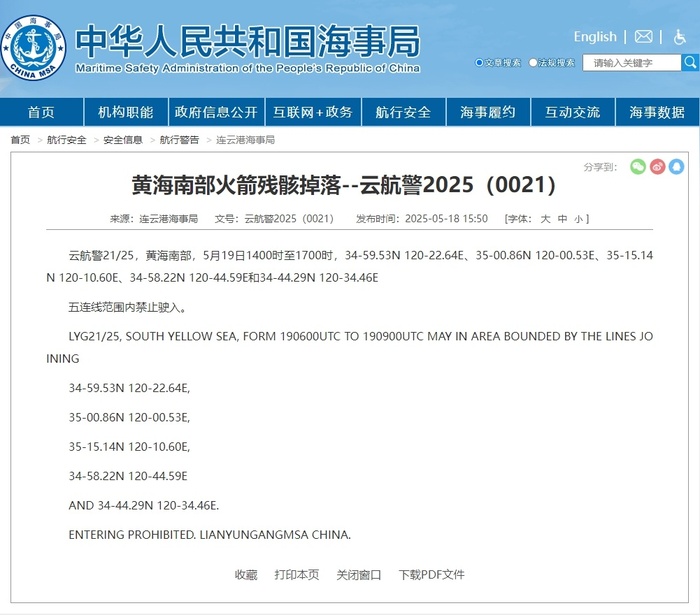 据中国海事局网站消息,连云港海事局发布航行警告,5月19日14时至17时,黄海南部火箭残骸掉落,禁止驶入。