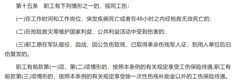 黎建飞教授认为,《工伤保险条例》第十五条(一)的第一要义是“突发”,而不是“后发”或者“间发”;第二要义是“当场”而不是”过场“或者“转场”;第三要义是“死亡”而不是“休息”;第四要义是或者当场死亡,或者当场送医48小时内死亡。四者缺一不可,其他任何扩展、演绎、相似、类比以及变形都有悖立法本意。