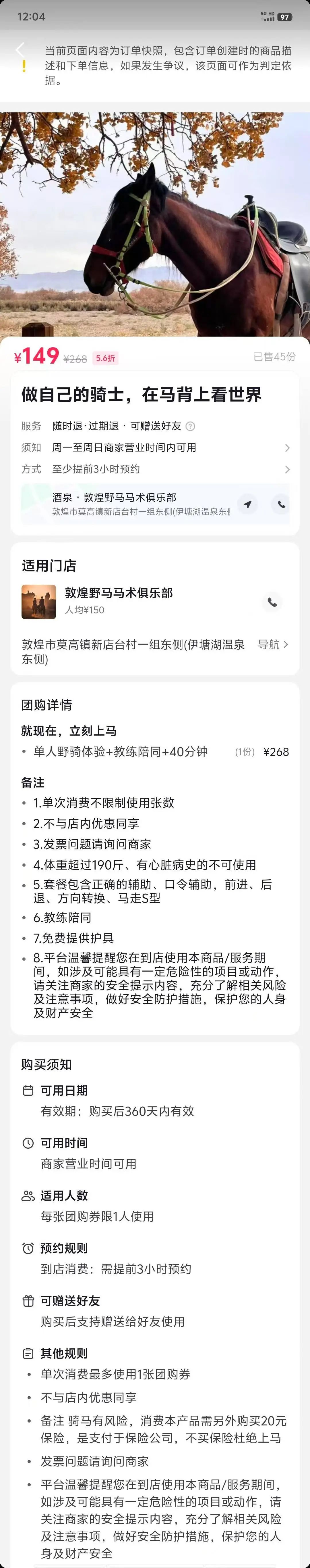 李晶第一次团购的截图,其中显示会提供免费护具,以及有教练陪同。