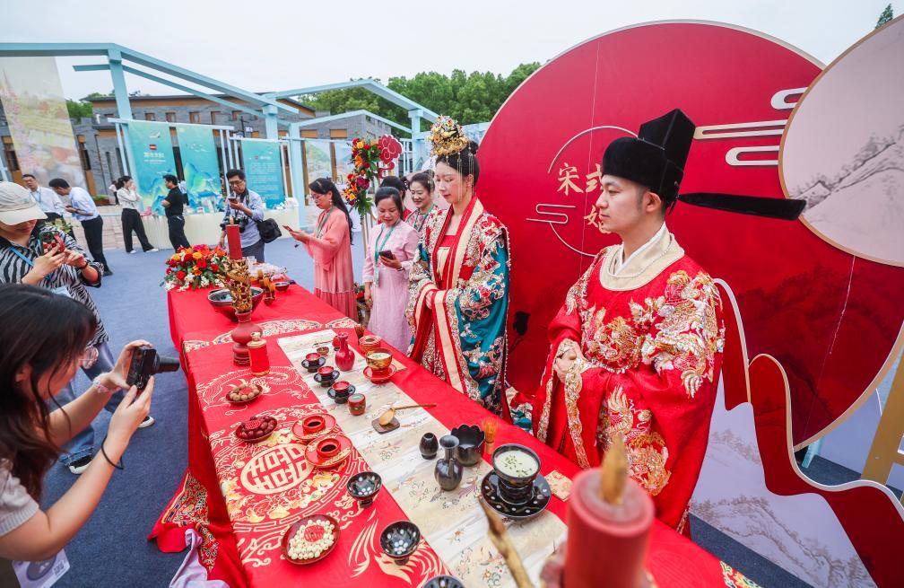 5月19日,在2025年“中国旅游日”全国主会场宁波宁海,当地“宋式婚俗”旅游产品展示吸引游客拍照打卡。新华社记者徐昱 摄