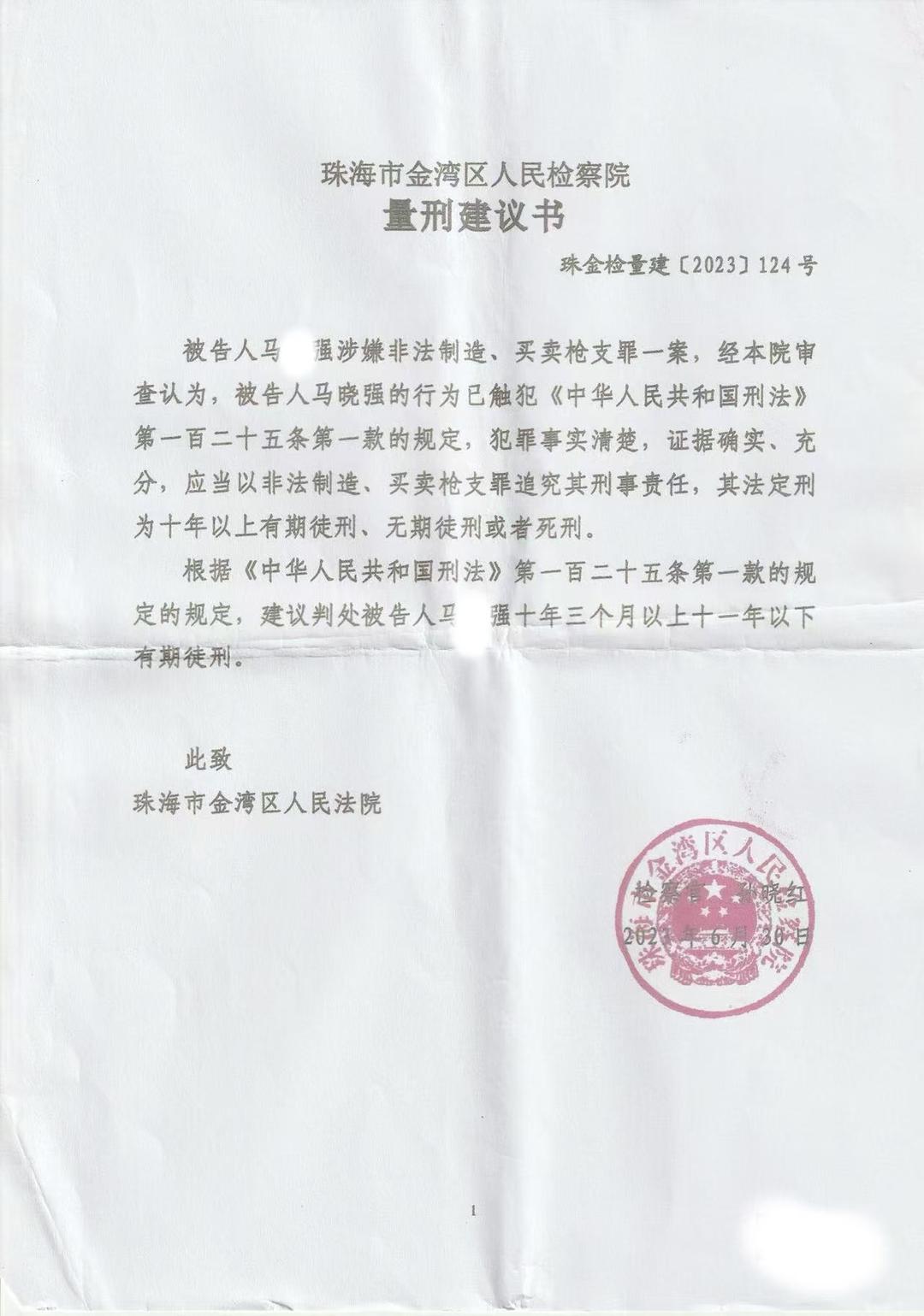 2025年2月,2025年5月中旬,马某强涉嫌非法制造、买卖枪支罪一案在珠海市金湾区法院开庭审理。