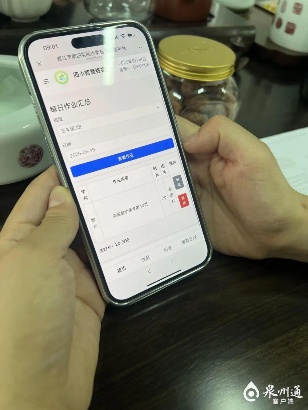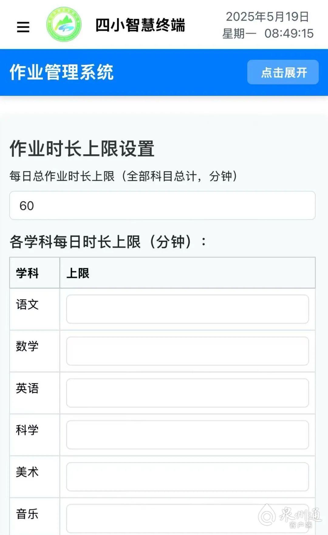“完成数学课本第40页,时长20分钟。”昨日下午,晋江市第四实验小学五年级二班的数学老师登录四小智慧终端的“作业管理系统”,录入当天的作业后提交。记者看到,系统上显示“每日总作业时长上限为60分钟”。
