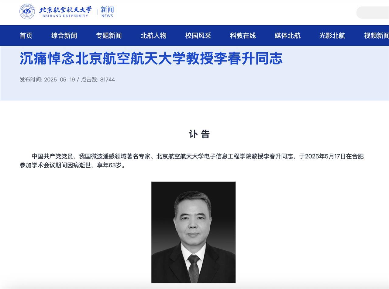 5月19日,北京航空航天大学发布讣告称,中国共产党党员、我国微波遥感领域著名专家、北京航空航天大学电子信息工程学院教授李春升同志,于2025年5月17日在合肥参加学术会议期间因病逝世,享年63岁。