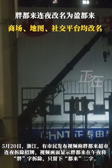 5月20日,浙江嘉兴。多位市民发布视频称,胖都来商场已将名字改为“盈都来”。视频画面显示胖都来在午夜将“胖”字拆除,留下“都来”二字,商场外墙上,红色的“胖都来”三个字已更为“盈都来”。