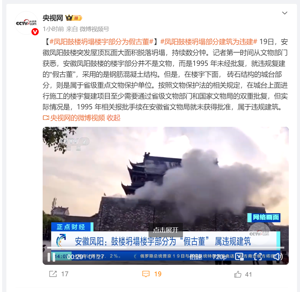 19日,安徽凤阳鼓楼突发屋顶瓦面大面积脱落坍塌,持续数分钟。记者第一时间从文物部门获悉,安徽凤阳鼓楼的楼宇部分并不是文物,而是1995 年未经批复,就违规复建的“假古董”,采用的是钢筋混凝土结构。但是,在楼宇下面, 砖石结构的城台部分,则是属于省级重点文物保护单位。按照文物保护法的相关规定,在城台上面进行施工的楼宇复建项目至少需要通过省级文物部门和国家文物局的双重批复,但实际情况是,1995 年相关报批手续在安徽省文物局就未获得批准,属于违规建筑。
