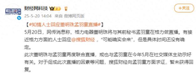 5月20日,据财经网科技,网传消息称,格力电器董明珠将与其前秘书孟羽童在格力做直播。有接近格力方面的人士回应称,“可能确实会来”,但是具体时间还没有确定。