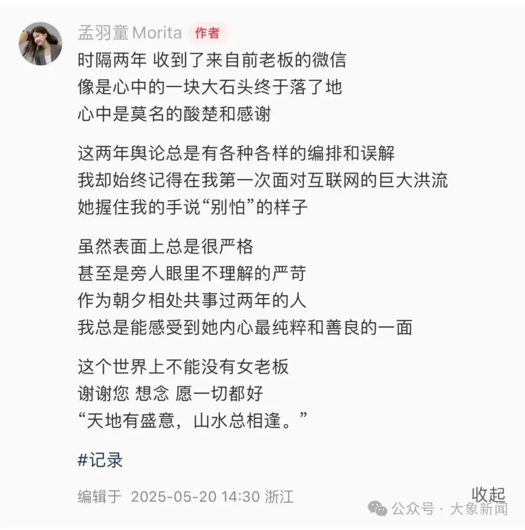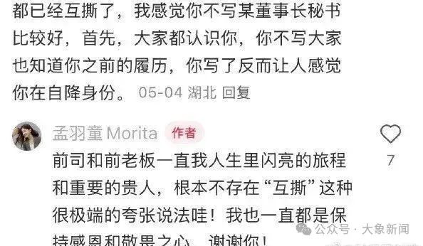 据此前报道,有网友曾在孟羽童的社交账号底下留言称:“都已经互撕了,我感觉你不写某董事长秘书比较好,首先,大家都认识你,你不写大家也知道你之前的履历,你写了反而让人感觉你在自降身份。”