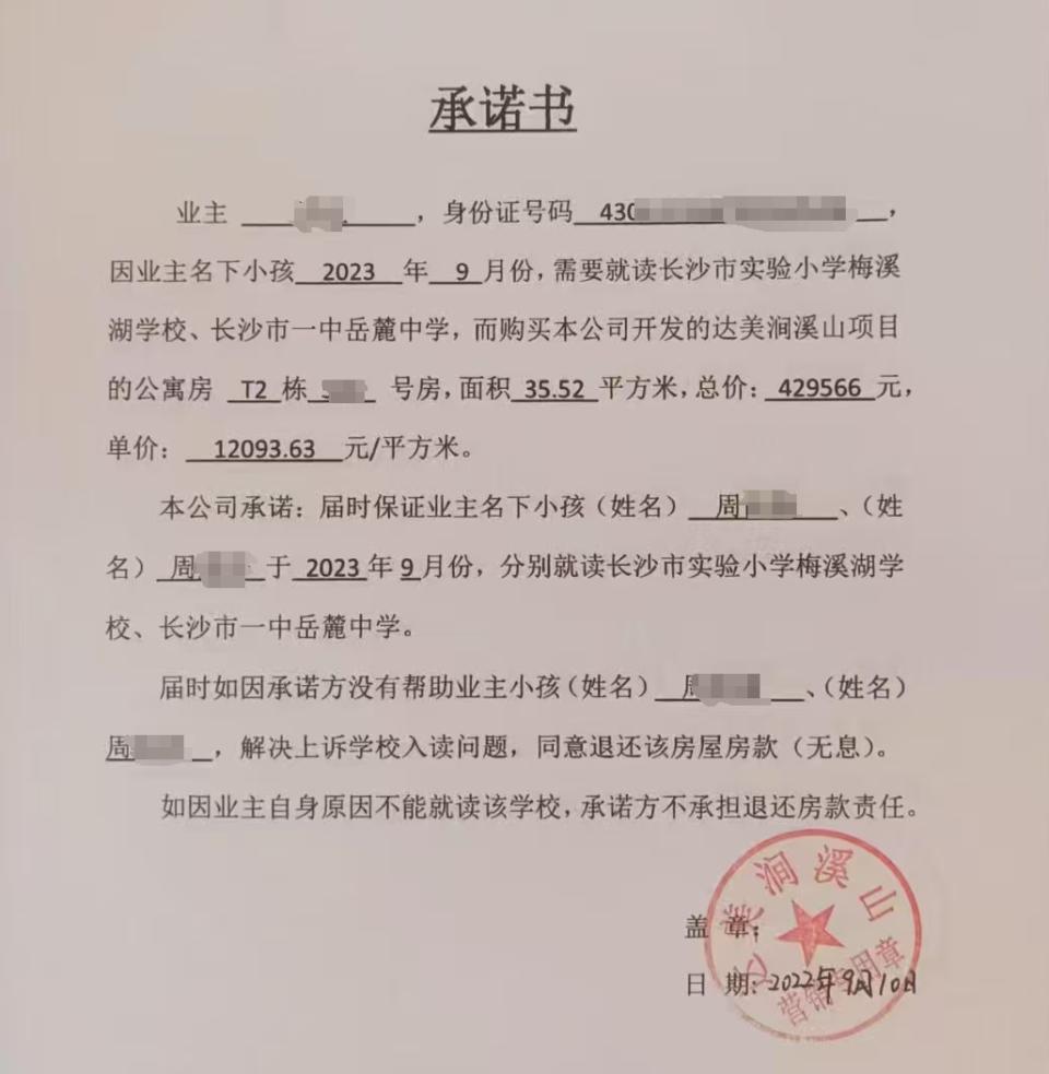 “买的时候开发商就和我们承诺了,当时我们觉得口头承诺不行,所以让开发商写了一个承诺书,我两个女儿在2023年9月如果没有读到这两个学校,我们可以全额退房。”周先生说,但在2023年9月,只有自己读初中的大女儿读进了,读小学的小女儿未能顺利进入学校。