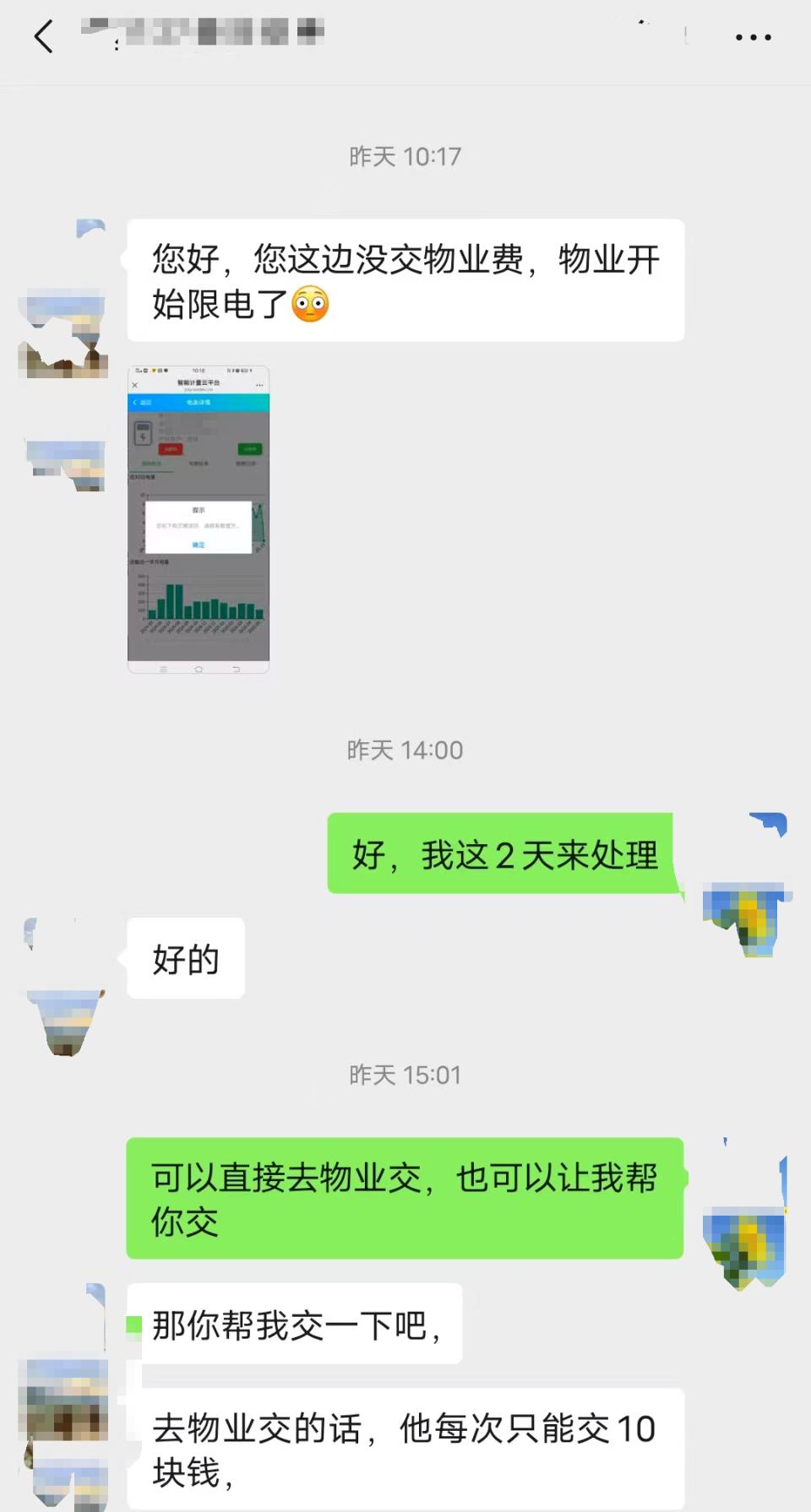 5月20日,晨意帮忙记者联系了开发商销售经理,她表示已将该情况反映给领导。物业工作人员表示,未限制周先生方交电费。