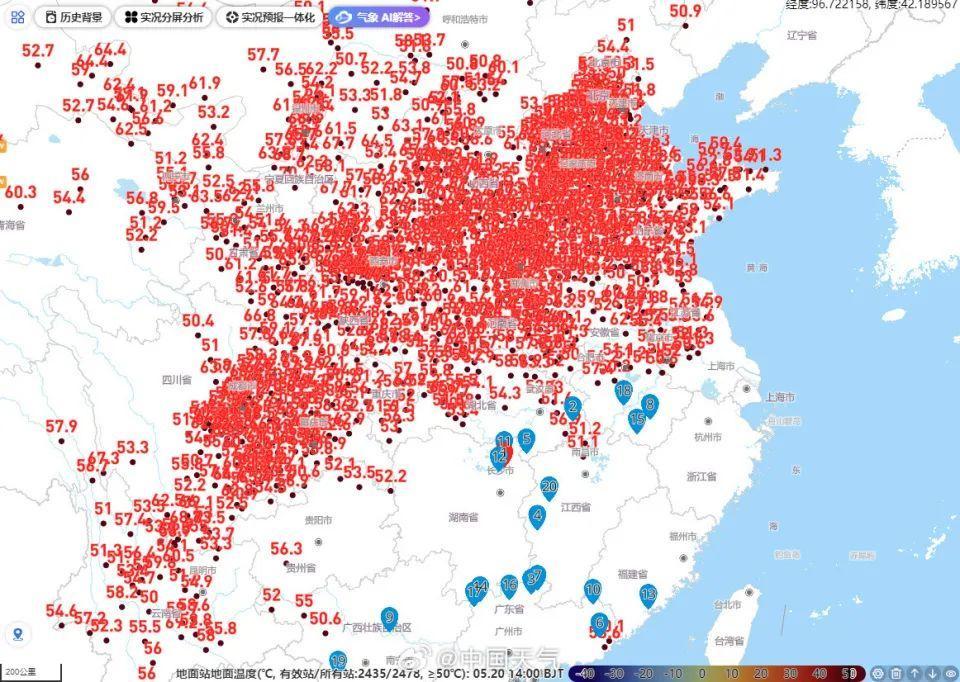 @中国天气网消息,今天午后,山西、河南部分站点地表温度超70℃。河南孟州72.9℃、山西阳城72.9℃、祁县72.1℃、永济71.5℃、万荣70.1℃、临猗70℃。阳城打破观测史最高地温纪录,孟州、祁县、永济、万荣、临猗均打破了5月最高地温纪录。上述站点也都是第一次在5月出现地温上70℃的情况。