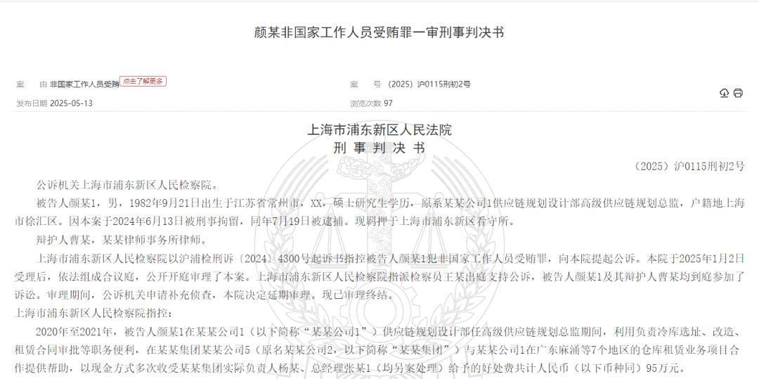 近日,上海市浦东新区人民法院公开的一份刑事判决书显示,叮咚买菜仓库供应商向一名高级供应链规划总监颜某行贿95万元,后者被判处有期徒刑18个月。