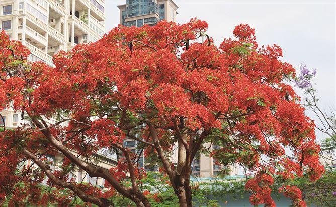 在集美鳌园路,凤凰花已然盛放。龙舟池碧波荡漾,头顶的凤凰花“叶如飞凰之羽,花若丹凤之冠”,从上到下都给人视觉的极致享受。一朵朵红云飞临,就像少女将胭脂轻轻抹在脸上,又好像晚霞坠落人间。微风拂过,朵朵红花坠落于水泥地上,成为朴实的灰路上细小美好的点缀。记者沿途走访发现,这一带的蓝花楹也还未凋谢,蓝色的烂漫还未褪去,红色的浪潮又已袭来,给人双重视觉享受。就读于集美大学的小李正和同学在树下拍照打卡,她说,尽管天气不太给力,但盛放的花朵还是让她们感觉到“不虚此行”。