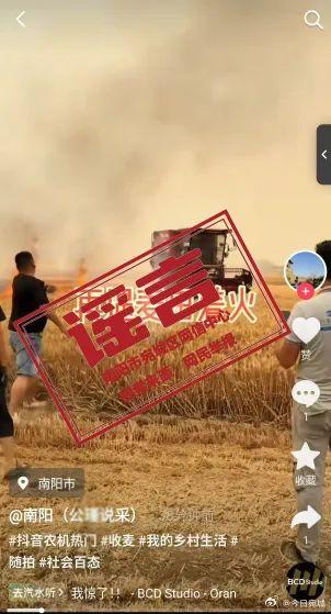 5月19日,网络平台账号“公某说采”发布视频称“南阳市宛城区再遇麦田着火”。经宛城区网信部门核实,该区未发生麦田着火事件,该视频系外地画面拼凑,此信息为谣言。目前,涉事账号“公某说采”发布者赵某洛已删除视频。网信部门正联合公安进一步调查,将依法处理。
