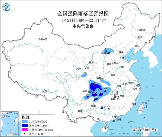 预计,5月21日14时至22日14时,甘肃南部、四川东部、重庆大部、贵州东北部、湖北西南部、湖南西北部以及江西西部、广西北部、内蒙古中部等地部分地区有大到暴雨,其中,四川盆地东北部、重庆西南部等地局地有大暴雨(100~140毫米)。上述部分地区伴有短时强降水(最大小时降雨量20~50毫米,局地可超过70毫米),局地有雷暴大风等强对流天气。