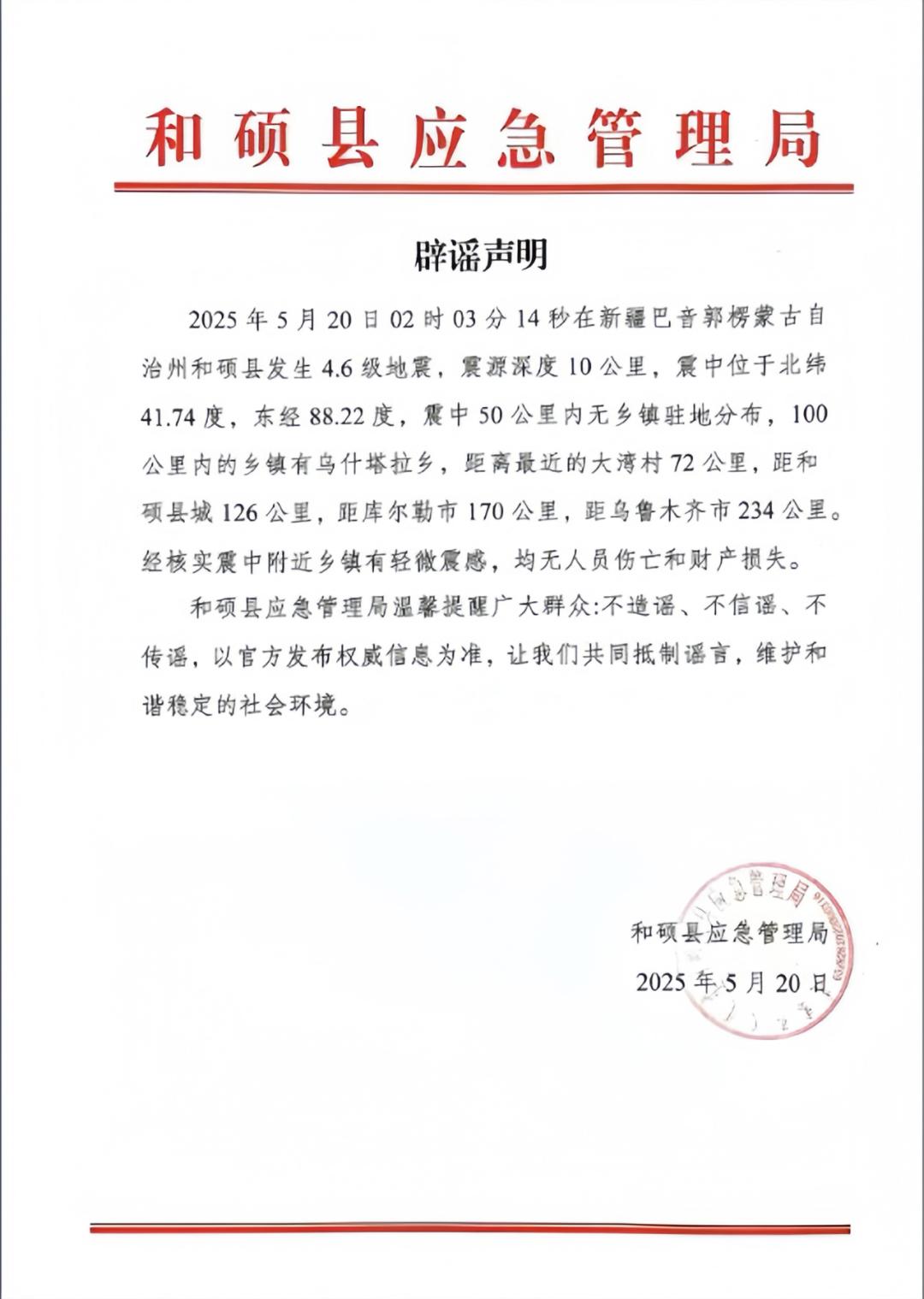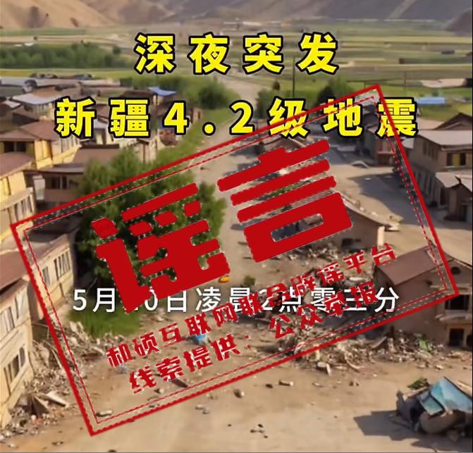 据中国地震台网正式测定,5月20日2时3分在新疆巴州和硕县发生4.6级地震,震源深度10公里,震中位于北纬41.74度,东经88.22度。接应急管理部门通报,震中50公里内无乡镇驻地分布,附近乡镇有轻微震感,均无人员伤亡和财产损失。但有部分自媒体账号为博取流量,编造拼接与此次地震不符的废墟图片,混淆视听、误导网民,造成不良社会影响。