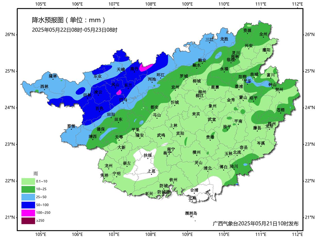 22日白天,百色、河池、柳州、桂林有小到中雨、局地大雨到暴雨,其他地区有阵雨或雷雨。22日晚上,百色、河池、柳州、桂林等市有大雨到暴雨、局地大暴雨到特大暴雨并伴有短时雷暴大风等强对流天气,其他地区小到中雨、局地大雨到暴雨。