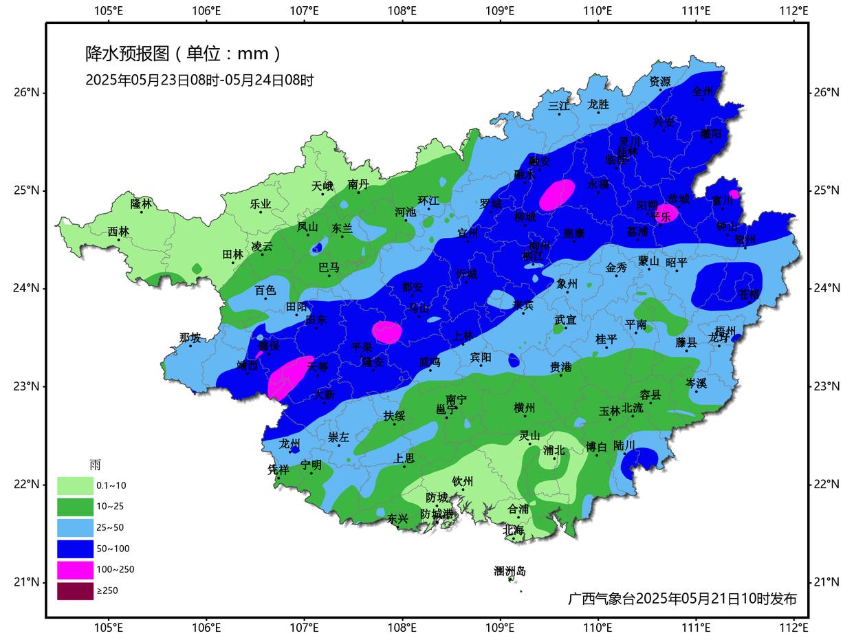 22日夜间至24日,广西将出现今年“龙舟水”期间首场强降雨,自西北向东南有一次大雨到暴雨、局地大暴雨到特大暴雨天气过程,累计雨量:桂北、桂中50~180毫米、局地250毫米以上,小时雨量局地可达100毫米以上,致灾风险高,需做好强降雨引发的洪涝及次生灾害的防御工作。