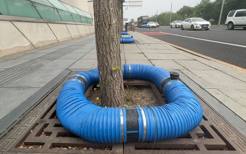 市民提供的照片显示,鼓起来的蓝色圆圈有点像游泳圈,被固定在树池上方的盖板上,银杏好似套圈游戏中被套中的礼物。据蓟城山水集团蓟城广安公司副经理冯毓嘉介绍,该圆圈是为行道树进行复壮、浇水时所使用的容器,为PVC材质,容量约60升。