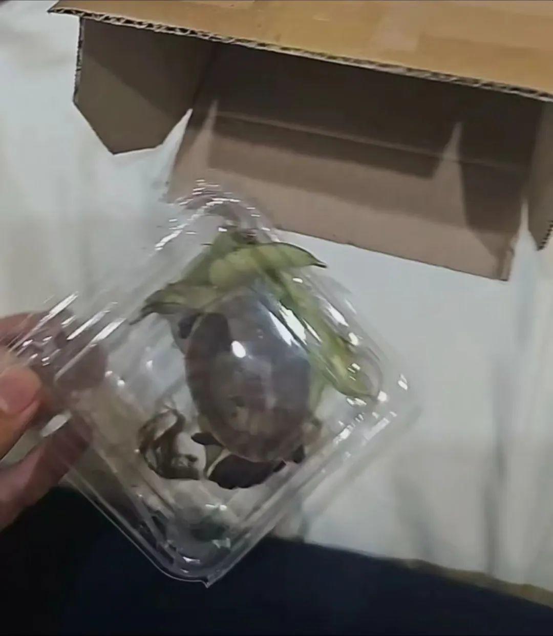 △有网友发视频称自己网购的乌龟运输盒内衬为毛豆壳,对此他表示不理解。图/网络