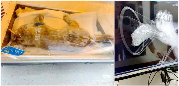 救治中的“大橘子”(左),疑似钢珠嵌入“大橘子”头部(右)。 网络图