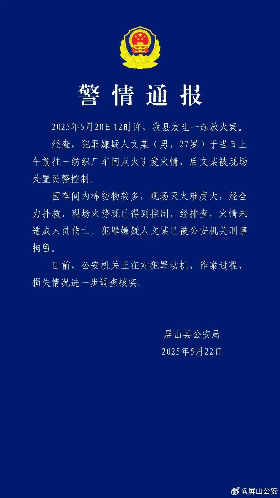 5月20日12时许,屏山县发生一起放火案。经查,犯罪嫌疑人文某(男,27岁)于当日上午前往一纺织厂车间点火引发火情,后文某被现场处置民警控制。