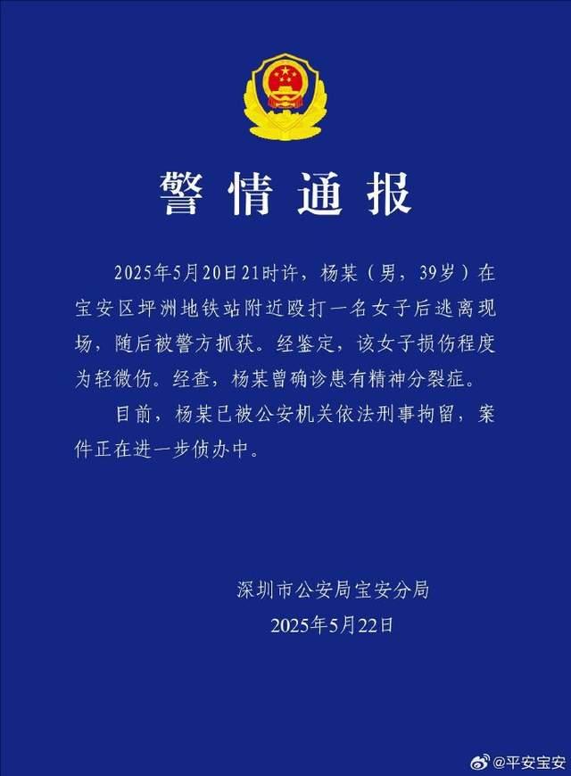39岁男子在地铁站附近殴打1名女子后逃离,深圳警方通报:已被刑拘