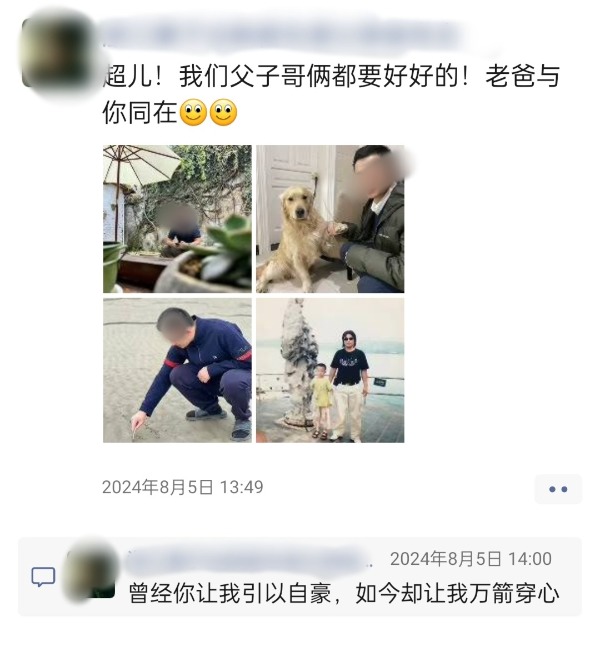 点开徐先生的朋友圈,记者看到,2024年1月15日,他发布了多张儿子结婚的照片,画面一片喜气洋洋,并配文“有情人终成眷属,希望你们能恩爱一生,百事顺遂!”而最后一条与儿子有关的朋友圈内容则停留在当年8月5日,他发布了多张儿子生前的照片,并配文“超儿!我们父子哥俩都要好好的!老爸与你同在”并留言“曾经你让我引以自豪,如今却让我万箭穿心”。两次内容发布时间仅相隔半年多。