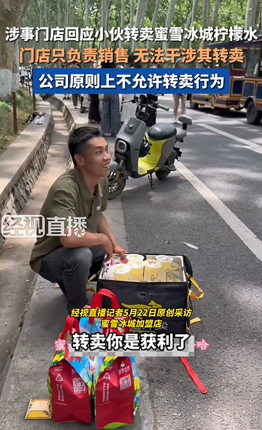 近日,南京某景区附近,00后小伙宋升浩一次性转卖98杯蜜雪冰城柠檬水,并赚取254元差价,此事引发关注。5月22日,当事门店回应称,对饮品杯转卖一事并不知情。
