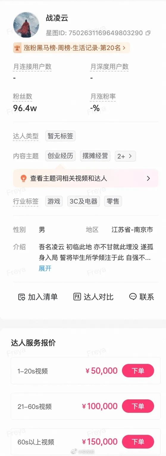 据@梨视频报道,平台数据显示,“战凌云”粉丝量已达99.5万,其5月18日发布卖倒卖柠檬水视频目前点赞量已超127.6万。第三方数据平台灰豚数据显示,19日该账号粉丝总量为54.2万,在20日-22日的3天时间内涨粉超45万。巨量星图数据显示,“战凌云”1-20秒视频报价为5万元,21-60秒视频报价为10万元,60秒以上视频报价为15万元。
