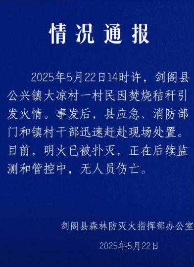 中新网广元5月22日电(苗志勇)22日傍晚,四川省广元市剑阁县森林防灭火指挥部办公室发布情况通报称:2025年5月22日14时许,剑阁县公兴镇大凉村一村民因焚烧秸秆引发火情。事发后,县应急、消防部门和镇村干部组织群众迅速赶赴现场处置。目前,明火已被扑灭,正在后续监测和管控中,无人员伤亡。