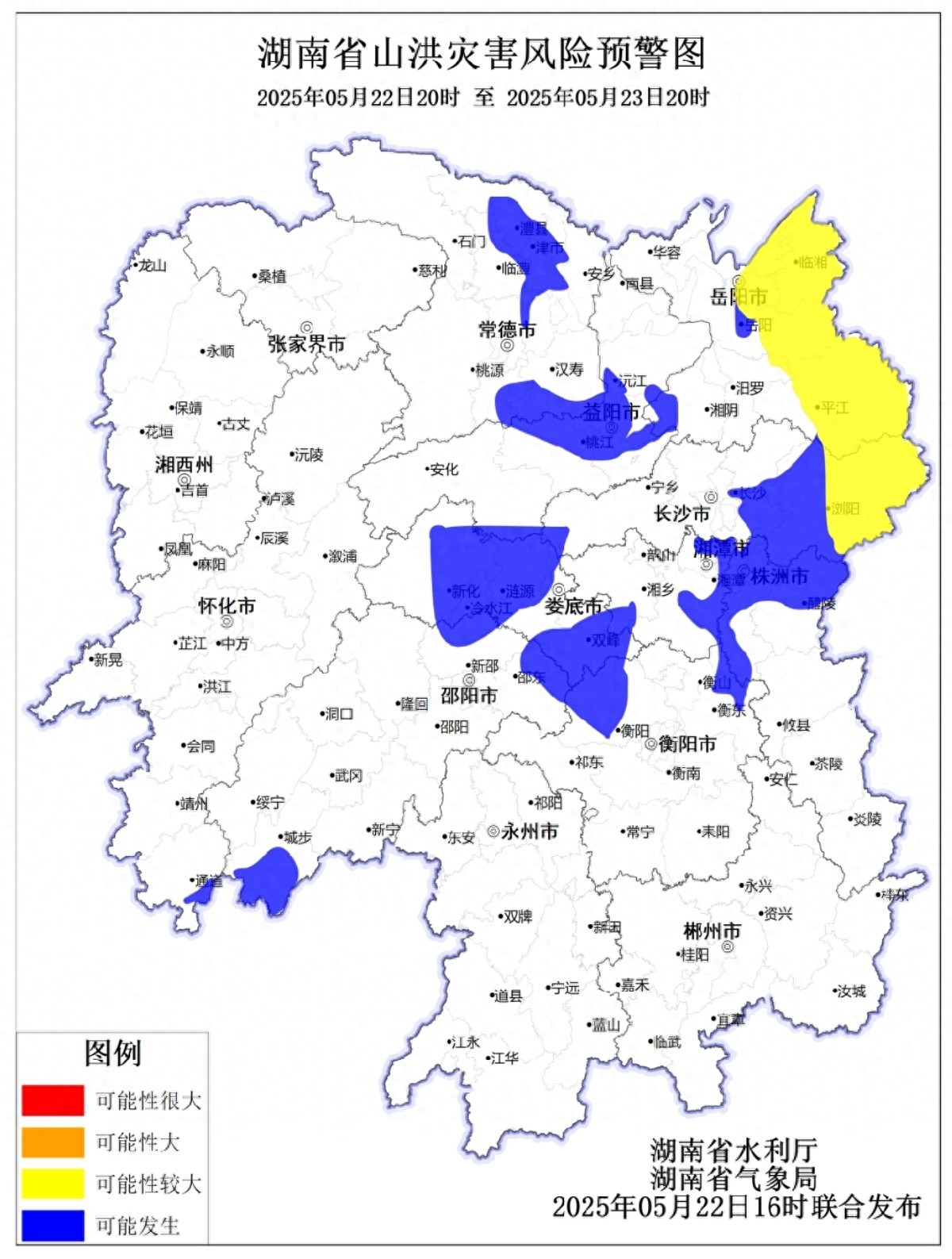记者从湖南省水利厅获悉,根据湖南省气象局5月22日预报,省水利厅与省气象局联合会商得出如下结论:受降雨影响,22日20:00至23日20:00,长沙市、岳阳市、株洲市、湘潭市、衡阳市、邵阳市、常德市、益阳市、怀化市、娄底市等局地可能发生山洪灾害,具体如下。