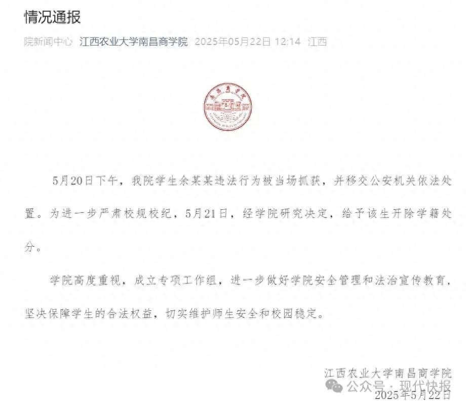 此前,江西农业大学南昌商学院学生发帖称,有男生偷拍女性时被当场抓获,手机里面存有多张不雅照,涉及女学生和在校女职工。5月22日上午,江西农业大学南昌商学院发布情况通报称,5月20日下午,该院学生余某某违法行为被当场抓获,并移交公安机关依法处置。为进一步严肃校规校纪,5月21日,经学院研究决定,给予该生开除学籍处分。