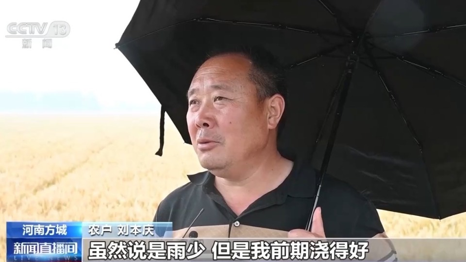 农户 刘本庆:我今年种了1300亩小麦,虽然雨少,但是前期浇得好,亩产与往年几乎持平,现在成熟度有八成熟了。