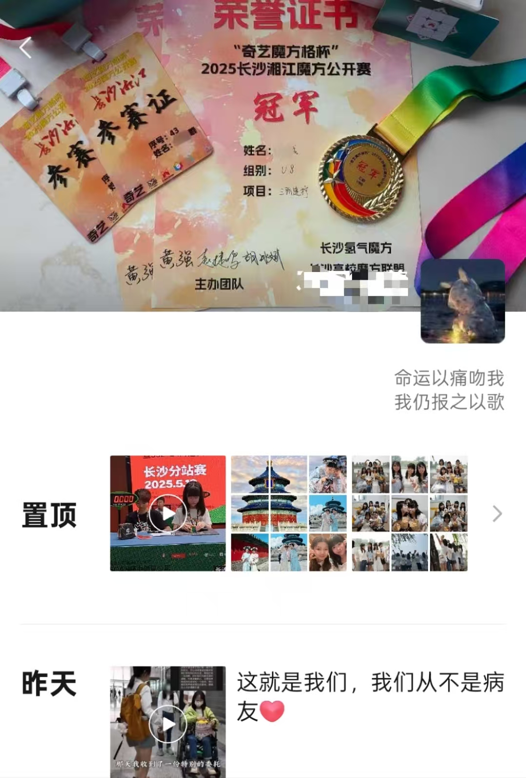 "我偶然看到别人玩魔方就跟风买了一个,它成了我唯一的乐趣。",2023年手术前她对魔方仅仅是兴趣,直到手术后一年只能卧床康复,那时的她甚至没有办法坐起来。