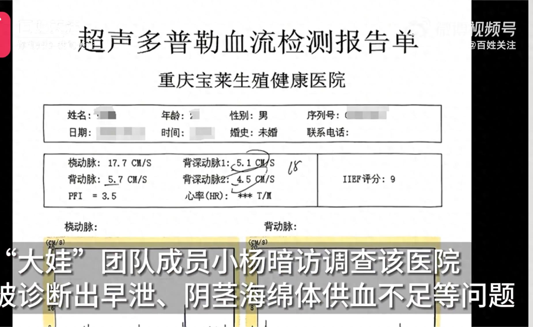 5月23日(播出时间),《百姓关注》记者采访到了打假博主“大娃”团队。通过一系列暗访视频,揭露该院通过虚构早泄、性功能障碍等病情,诱导患者接受天价治疗。在三甲医院体检显示健康的状况下,暗访者被诊断出"早泄""阴茎海绵体供血不足"等多项病症,首日即被安排"降敏针""冲击波"等疗法,共缴纳21786元治疗费。