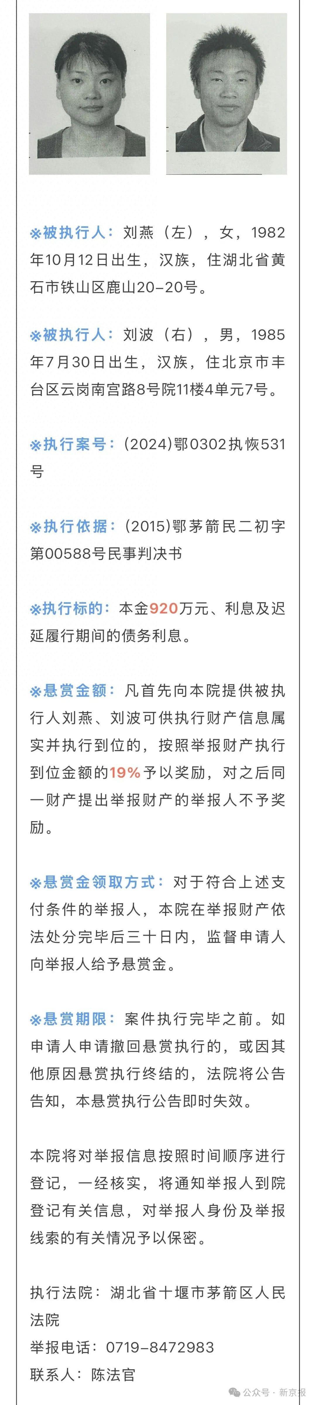 公告显示,案件执行标的为本金920万元、利息及迟延履行期间的债务利息。凡首先向茅箭区院提供被执行人刘燕、刘波可供执行财产信息属实并执行到位的,按照举报财产执行到位金额的19%予以奖励,对之后同一财产提出举报财产的举报人,则不予奖励。按照上述悬赏比例,赏金可达到174万余元。