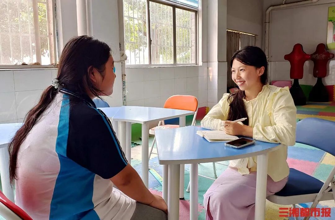 笑容明媚的张雅婷(图右),在为学生进行心理辅导。