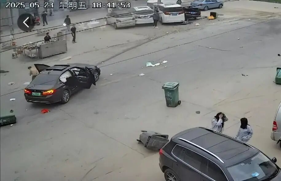 监控视频显示,事发时间为5月23日下午6时41分许,一辆黑色轿车疑似失控,冲向路边,撞翻多个垃圾箱后,又撞上路旁停靠的车辆,引发连环碰撞。现场至少4辆车发生剐蹭。