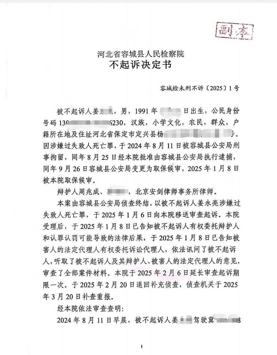 此事引起广泛关注。2025年5月24日,姜某委托的辩护律师周兆成向华商报大风新闻记者证实,4月12日,容城县人民检察院就姜某涉嫌过失致人死亡罪一案举行不公开听证会,4月20日检察院最终对姜某作出酌定不起诉决定。