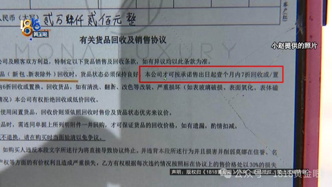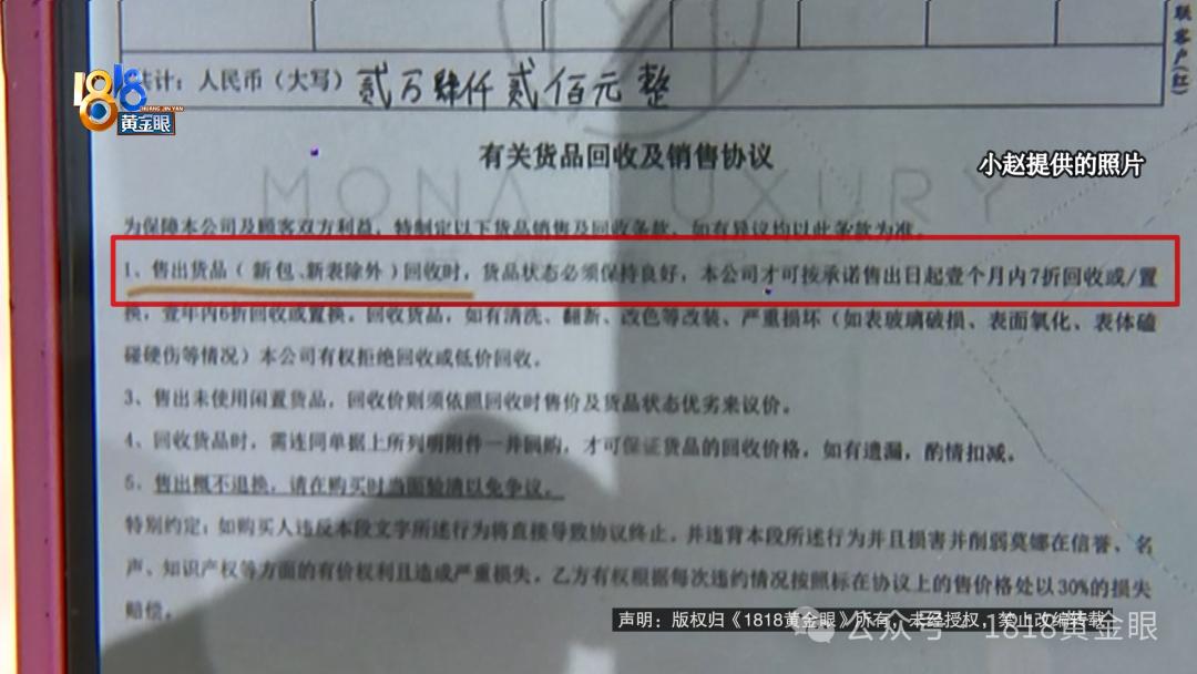 照片显示,这张销售单上有“莫娜奢侈品”的抬头,上面还有店员小葛的签名“有关货品回收及销售协议”的格式条款中有这样一行文字,“售出货品(新包、新表除外)回收时,货品状态必须保持良好,本公司才可按承诺售出日起,一个月内7折回收/置换”。